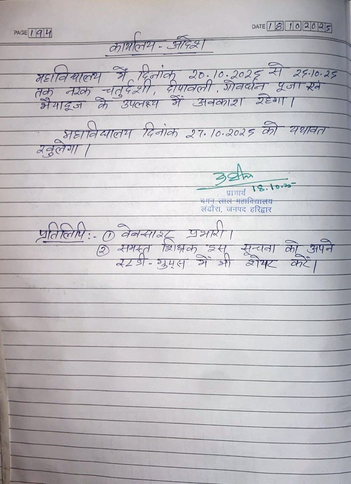 HOLIDAY DEEPAWLI (20-10-2025 To 25.10.2025)